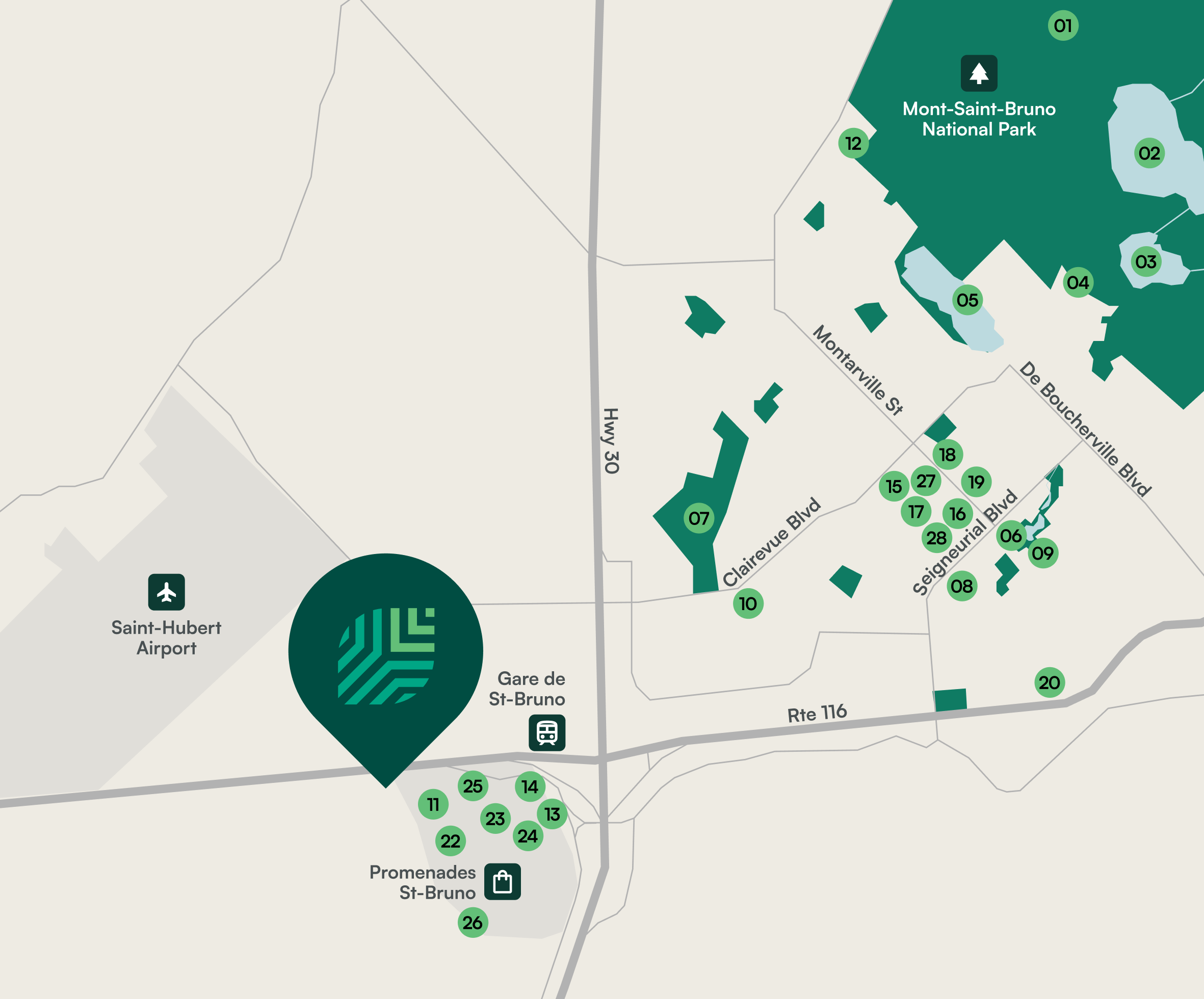 - Nestled between the 7 Lakes, the mountain, and Mont-Saint-Bruno National Park.